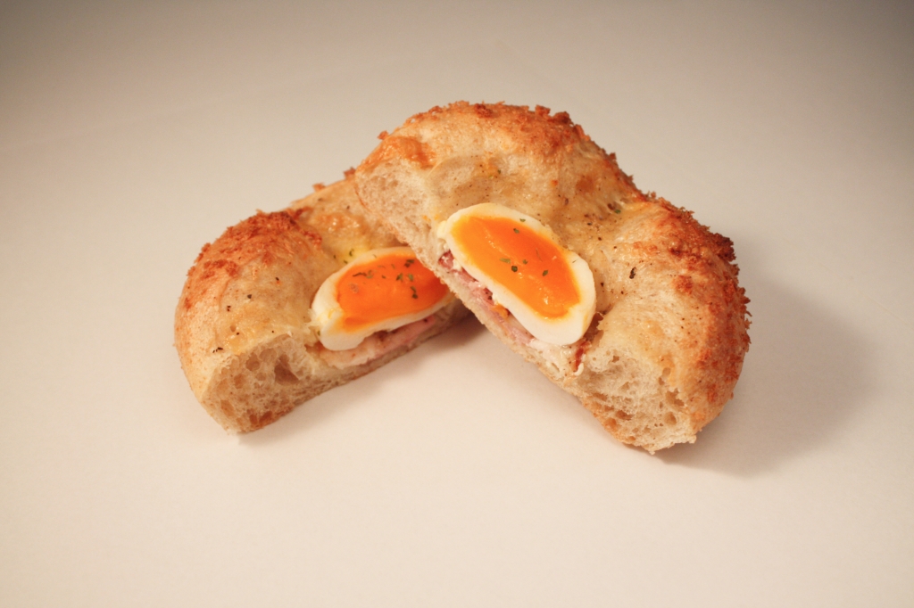 ふわふわのフォカッチャ生地に半熟タマゴを乗せました。